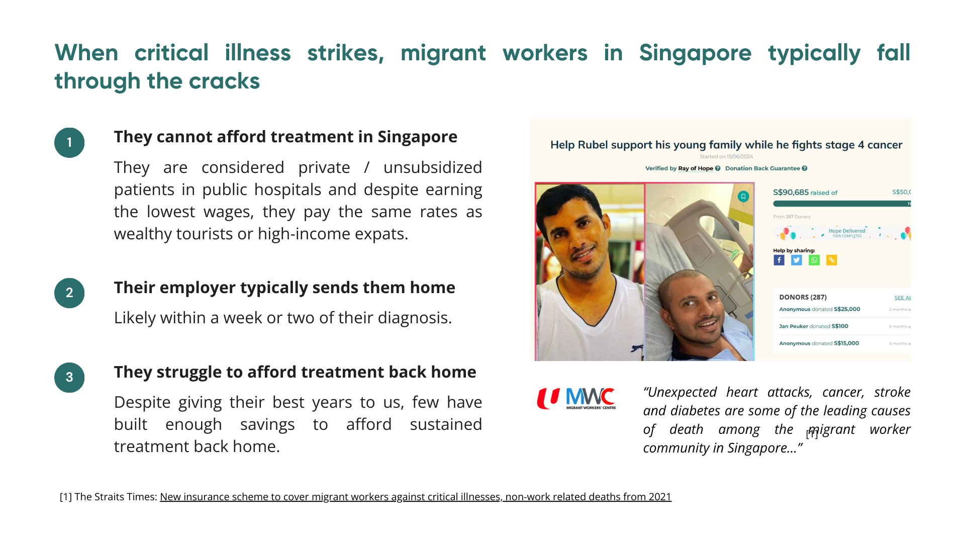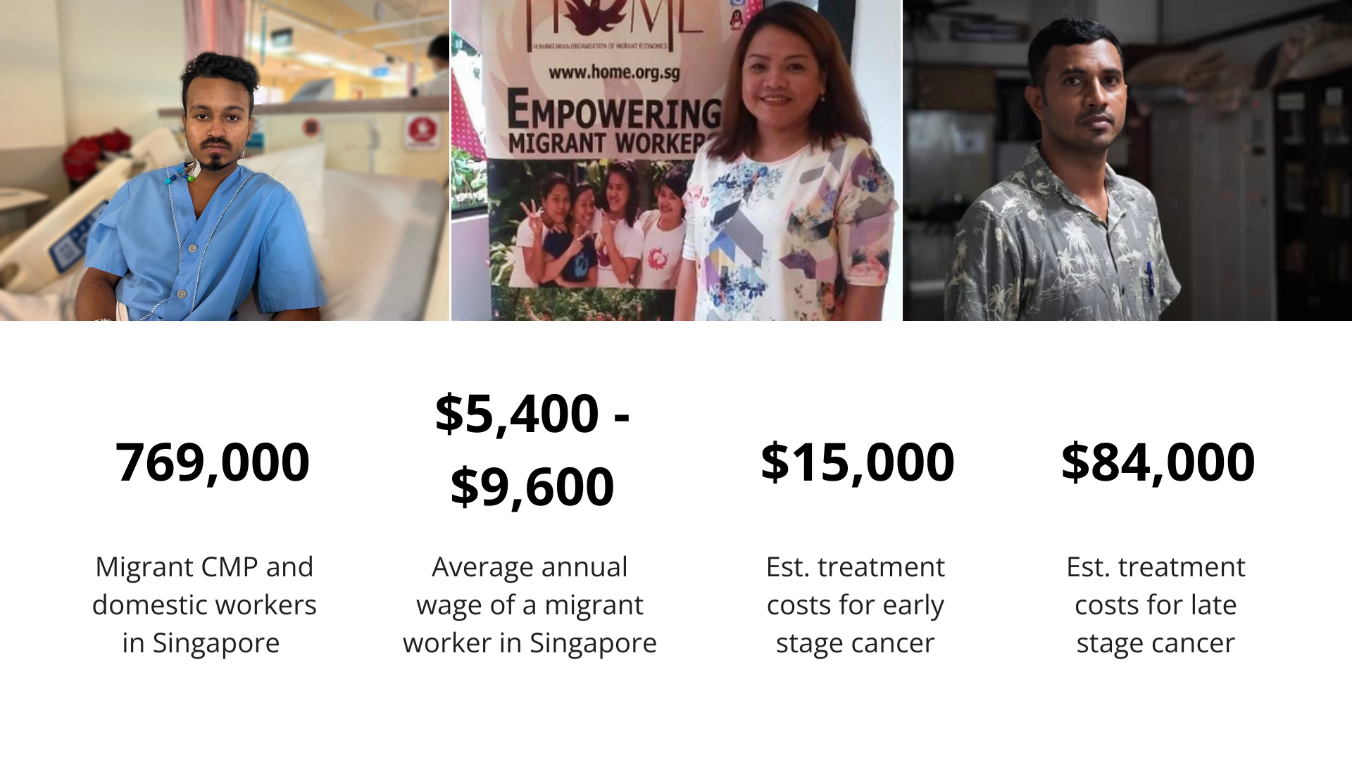 We (Anthea, Vincent and Dhanesh) are a group of friends who have helped migrant and domestic workers with non work-related critical illnesses, such as cancer, to set up crowdfunding campaigns for their treatment and living expenses. Through this work, we have witnessed the heartbreaking struggles of these low-wage workers who cannot afford the high medical costs in Singapore or back home, despite years of hard work.