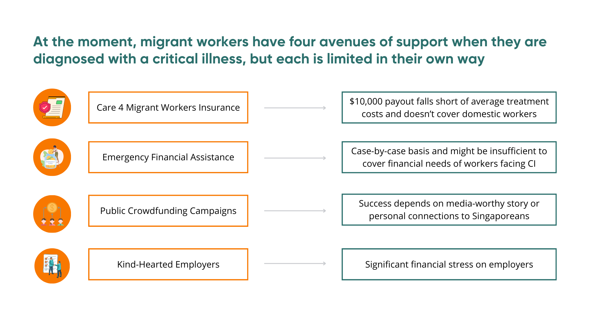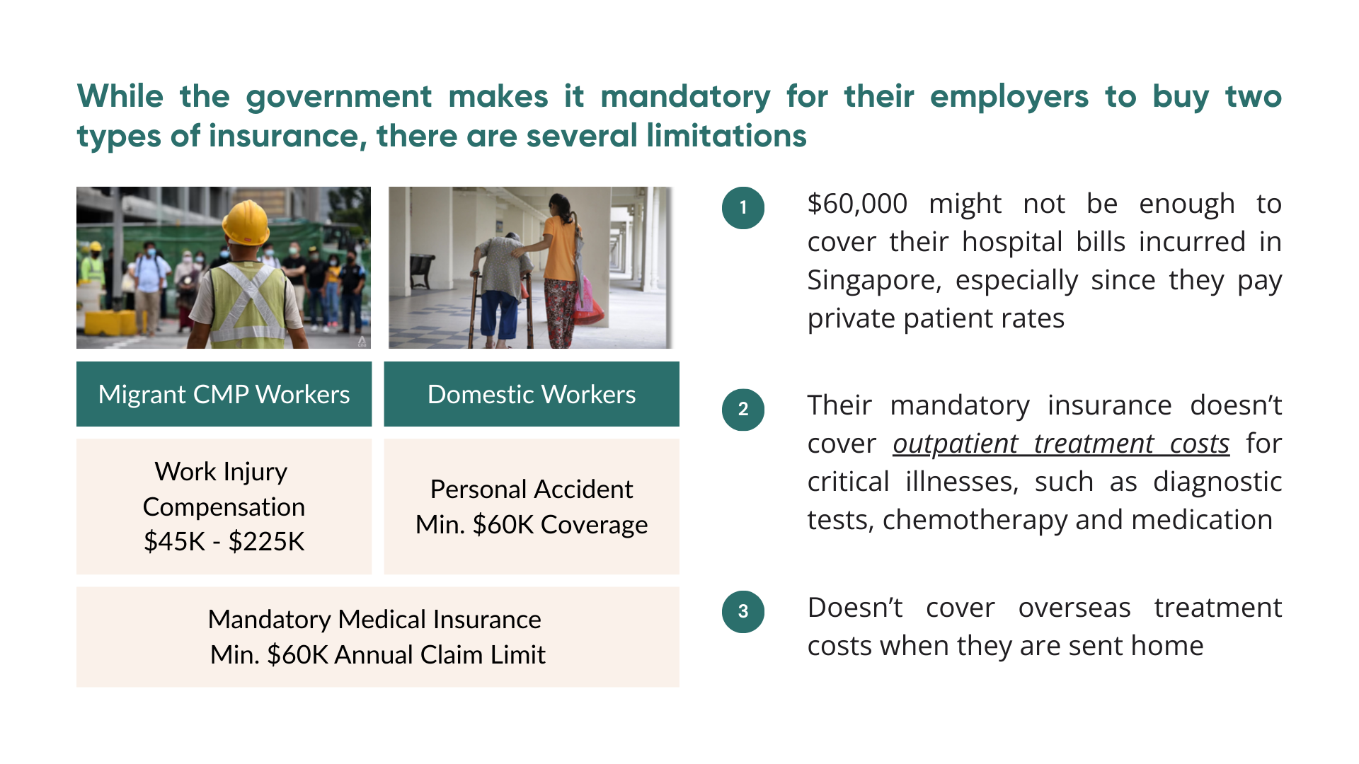 - Insurers: Little market incentive to provide subsidised premiums or expanded coverage for migrant workers with critical illnesses