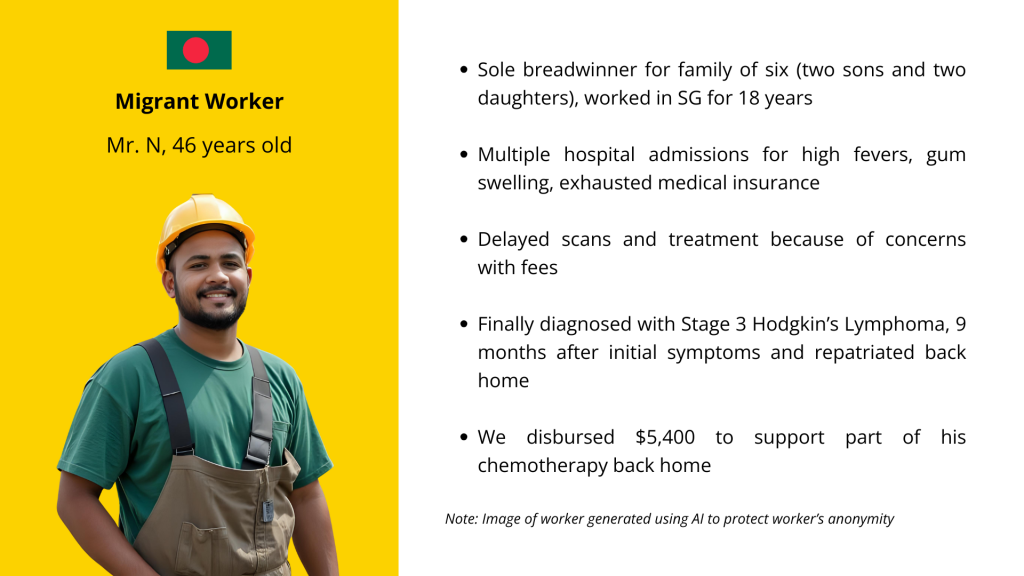 - N, a 46-year old migrant construction worker who was diagnosed with Stage 3 Hogkin’s Lymphoma